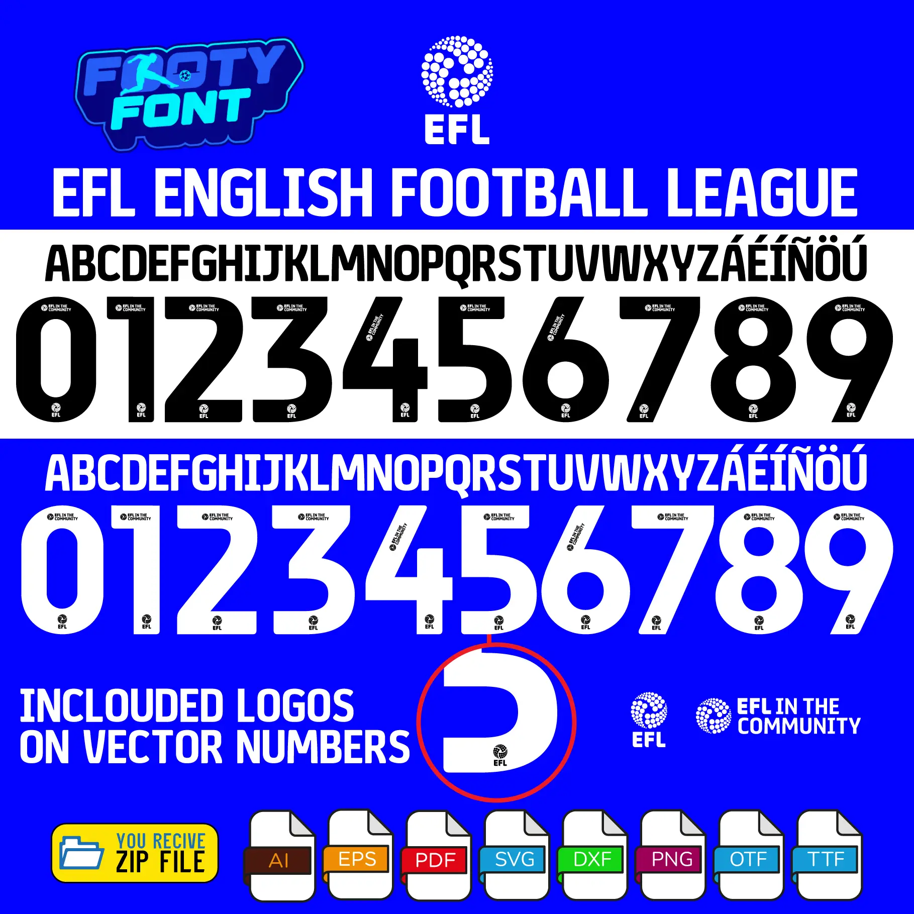 Designed with ultimate authenticity in mind, the vector numbers include both the iconic EFL logo at the base and the “EFL in the Community” text at the top. Whether you are designing custom kits for historic heavyweights like Leeds United and Sheffield Wednesday, or creating fan gear for global sensations like Wrexham AFC, this font is an absolute must-have for authentic English football Font designs.