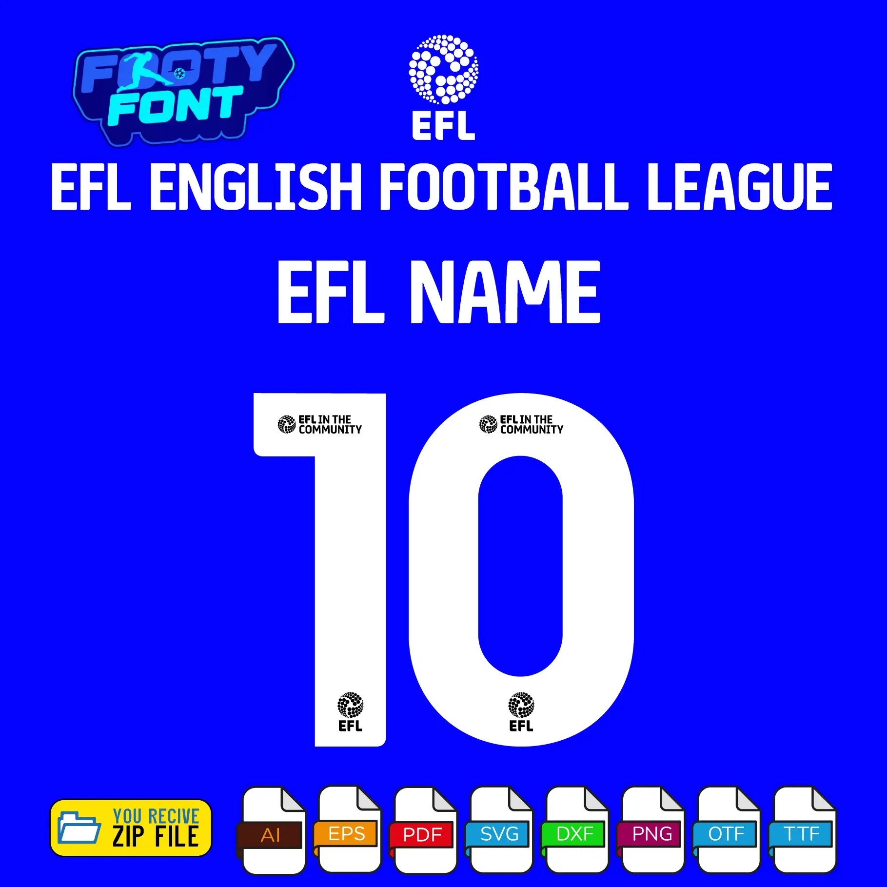 Don’t wait to bring your creative vision to life. Get this versatile font kit and instantly start creating personalized jerseys, matchday posters, and graphics that celebrate your favorite EFL club. Click “Add to Cart” now to begin your project.