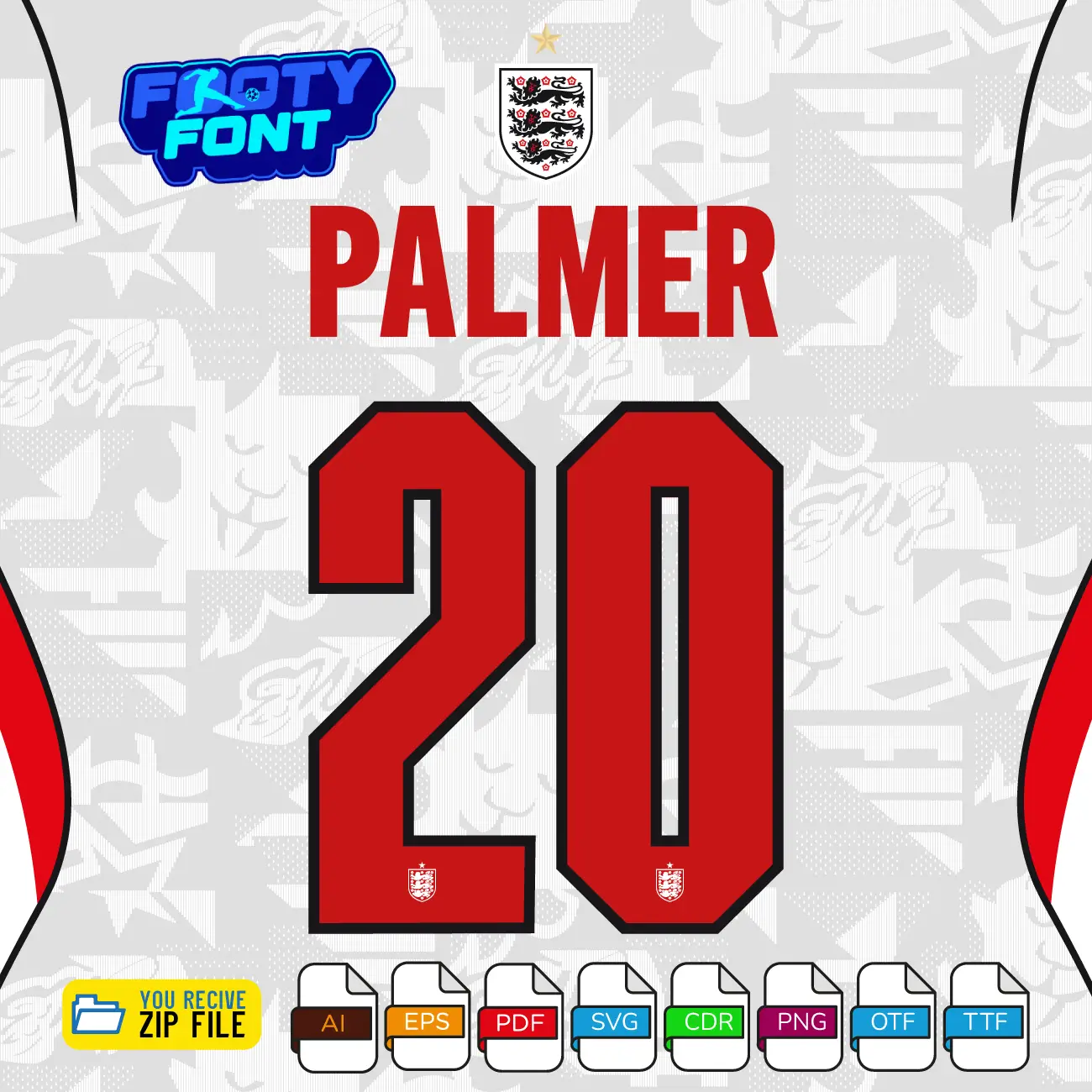 This font captures the elite style worn by England’s world-class stars like Cole Palmer, Jude Bellingham, Bukayo Saka, and Harry Kane. As England prepares to compete on the global stage, this home font is an absolute must-have for fans creating custom jersey designs, digital art, streetwear, or matchday posters.